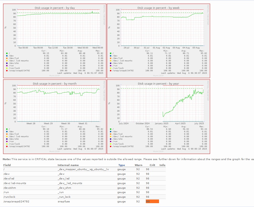 We’re currently running a DHIS2 instance using LXD containers (PostgreSQL, DHIS2 app, Nginx, Munin) on a physical Dell R750xs server with 2 × Xeon 4310 CPUs, 128GB RAM, and 4 × 480GB SATA SSDs in RAID 10. We’ve started seeing severe performance degradation recently with Munin reporting disk usage exceeding 85%, leading to frequent timeouts and other issues. We suspect disk I/O (saturation) may be the main issue.